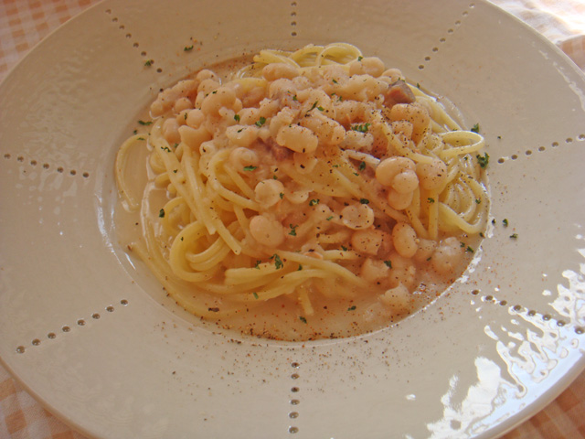 - スパゲッティを記載された時間より3分短くゆで、1に入れてさらに3分ゆでる。とろみが出てきたら完成。仕上げに黒こしょうとオリーブ油をかけてどうぞ。