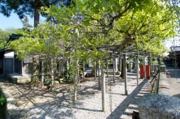 「石田三成公お手植えの藤」という文字列があった。藤のある「春日神社」は世継会館と道路を挟さんだ向こう側にある。僕は『三成伝説』(サンライズ出版・2009年)でその藤のことを知り何時かは観てみたいと思っていたから、運命を感じた。『三成伝説』には飯と世継とを結ぶ農面道路の看板を頼りに春日神社にたどり着いたと書いてある。僕が見たMAPは二世代目ということだろう。 春日神社の藤は満開ではなかったが、それでもこの場所に立つことができた喜びは十分にあった。「世継の春日神社で戦勝祈願をした三成はその記念にと一株の藤を植え、美濃(岐阜県)へと出立する」(『三成伝説』)。想像してみる……。
