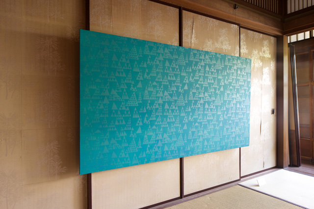 安藤家母屋の二間には、四枚立の襖をはじめ、「生命力」を題材にした新作のパネルや襖紙を折ってつくられたオブジェなどが展示されている。どれも安藤家の建物の空間を生かしてそこに合うように制作されたものだ。なかでも「とおくをみる」と題したパネルは、安藤家にもともとあった大正時代の襖を背景にして額に見立て、襖と同じ雲母摺りの技法を用いてつくられていて、見る角度によって雲母が光りそれぞれの模様が浮かび上がる。大正と現代、同じ技法で摺られた唐紙が100年の時を超えておりなすその対比は美しく、なにか宿命のようなものさえ感じる。