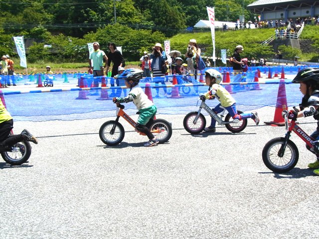このイベントで使われたランバイクとは、ペダルとブレーキのない子供向けの自転車様の乗り物のこと。地面を足で蹴って走る。バランス感覚や脚力が養われることから、自転車に乗る練習をするために使用されることも多く、この乗り物で遊んでいると特別に練習しなくてもすぐに自転車に乗れる子も多いという。さまざまな会社がランバイクを販売しているが、対象年齢は主に2歳から5歳の子供たち。「27キロ以下」など、体重制限のついているものもある。このなかでも最も知名度があり、販売台数も多いとされるのが、アメリカから来た「ストライダー」。日本でもすでに12万台以上が販売されたという。