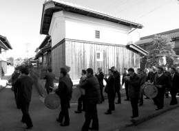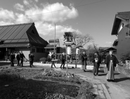 午後1時30分過ぎ、風に乗って笛の音が聞こえてくる。鉦や太鼓の音も重なる。三つの塔家から行列が公民館に集まる。御鏡を三つつくるのは、乃伎多神社の、本堂、薬師堂、不動明王堂にそれぞれ供えるためだ。行列は一つになり集落を周り神社へと向かう……。