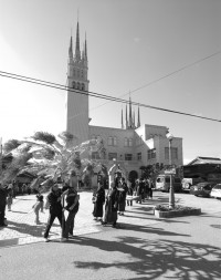 2月8日、高月町東阿閉(ひがしあつじ)のオコナイを見に行った。乃伎多神社(のぎたじんじゃ)の祭礼である。三つの塔家(とうけ)に分かれ、それぞれ8人の年番が世話をしながら御鏡をこしらえ、公民館では「舞玉(マイダマ)・1頁写真参照」づくりが行われていた。大抵は、マユダマとかモチバナと呼ばれているもので、ケヤキやヤナギの枝に餅を付けたり巻いたりするのだが、東阿閉のそれは青竹を使う独特のものだった。2月5日の夜に準備が行われ、8日に短冊を付け、餅を巻いて完成させる。
