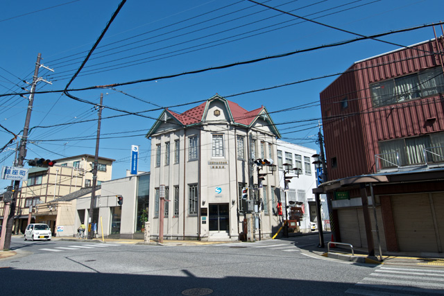気になったので、建物の来歴を調べてみた。デビューは明治銀行彦根支店だった。棟札が残っており大正7年(1918)11月25日の上棟であることが判っている。明治銀行は明治29年(1896)名古屋に本店を置いて開業した金融機関で、昭和2年(1927)の金融恐慌、同5年〜7年の昭和恐慌で、昭和7年(1932)に破綻。その後、建物はさまざまに転用され、戦後は産婦人科医院として使われていた。昭和33年(1958)に彦根信用金庫が購入し、昭和34年(1959)7月から銀座支店として用いられている。
