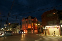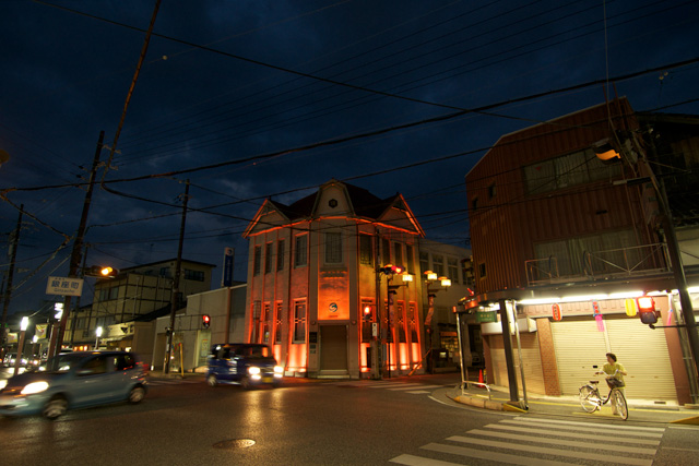 僕は、久左の辻の空を区切る電線の交差が好きで、銀座支店を入れて写真を何度か撮ったことがある。赤い屋根を戴いた背の高い2階建ての建物が映る光景は何処か遠くの素敵な町のようだった。ライトアップも撮ってみた。大正7年から変わらぬ姿は、今までにない全く新しい彦根のランドマークだった。