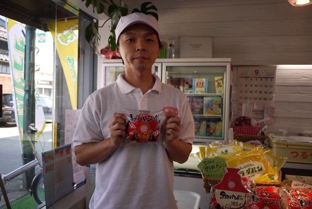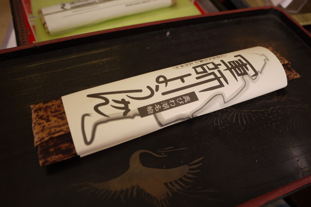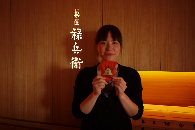 和菓子屋「菓匠禄兵衛」さんでは、官兵衛の有名な赤い合子形兜があしらわれたデザインのパッケージに包まれた「本之木餅」。「もとのきもち、という商品ですが、その心は、ほんのきもち(気持ち)です」と、パッケージのデザインに携わった西澤奈都美さんが教えてくれた。地域の歴史に関連するパッケージ、気のきいた名まえ。地元の方のお使いものによく利用いただいてますとのこと。なるほど訪問先で、きっといい話のたねになる。