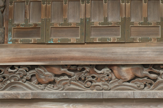 竹生島文様は長浜市湖北町小今の日吉神社のように、大抵、前方を見据え波間を跳ぶうさぎと、振り返るうさぎの二匹のうさぎが対となっている。或いは、月が描かれているものでは、月が出ているものと出ていないものを組み合わせているものもあり、数々のバリエーションがある。僕が見てきたものは、その全てが、「うさぎ」「月」「波」の組み合わせであった。
