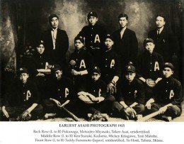 1915年 初代朝日チーム。後列左から2人目、宮崎松二郎・中央列左から3人目、北川初次郎・前列左から3人目、北川(堀居)由太郎(彦根市教育委員会 歴史民俗資料室 小林 隆氏所蔵『Asahi : A LEGEND IN BASEBALL』より)