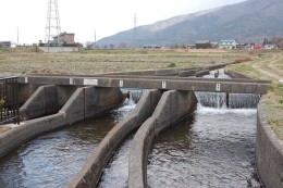 川の始まりに名札がつけられているのは珍しい。調べてみると、この間田五川分水工は、中世の荘園時代から続く農業用水で、周辺の人たちが仲良く水を分け合うために作られたものだそうだ。それが現代でも補修されて、受け継がれている。
