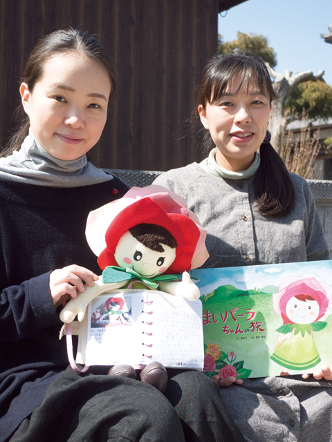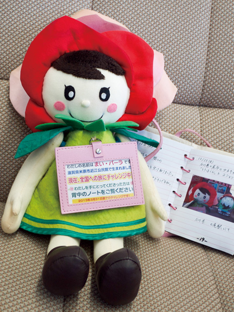はじまりは、米原市近江公民館のゆるキャラとして、「まいバーラ」が誕生したこと。バラのぼうしをかぶった丸い笑顔の女の子のキャラクターは、当時公民館に勤務していた藤林麻弥さんがデザインした。「公民館で布遊び教室の講師をしている甲斐沼京子さんが人形にしてくれたんですが、あまりにかわいい出来だったんで、旅に出して、いろんなひとに見てもらおうということになったんです」と、公民館館長の山田裕美さんは話す。