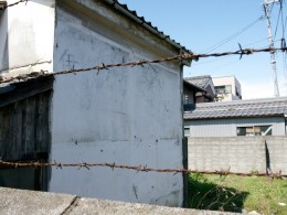 長浜市大宮町、大通寺に向かう通りにある駐車場に隣接するブロック塀の向こう側に白壁の蔵のような建物があった。中心市街地にぽっかりと明るい空き地があり、有刺鉄線も懐かしい。白壁に落書きがしてあった。