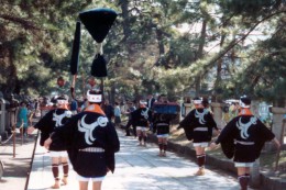 先箱、立傘、毛槍などといった七つ道具を、掛け声と手拍子に合わせて投げ交わし、持ち手が交替する。八幡宮の一の鳥居前では、薙刀持ちが薙刀を「入」の字を描くように振ってから鳥居に入る。