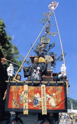 昔、上丹生と下丹生の境近くにある末遠(すえとお)という所で、良質な陶土が産出し、そこで作った陶器を毎年、丹生神社に奉納したのが祭りの由来といわれている。末遠とは須恵陶の意味であり、古い陶器そのものを指している。 祭りの華は、なんといっても陶器を絶妙のバランスで組み上げた山飾りだろう。丹宝山(北村組)、永宝山(中村組)、寿宝山(橋本組)の3基の曳山それぞれが、毎回、異なったテーマで飾りつけられる。飾りつけるといっても単純に陶器を上に重ねているだけではない。芸題に沿って茶わんや皿、花瓶などをちぐはぐに組み合せ、わざと重心が偏よって見えるように作られている。これで祭り当