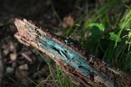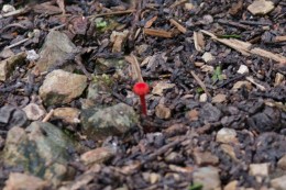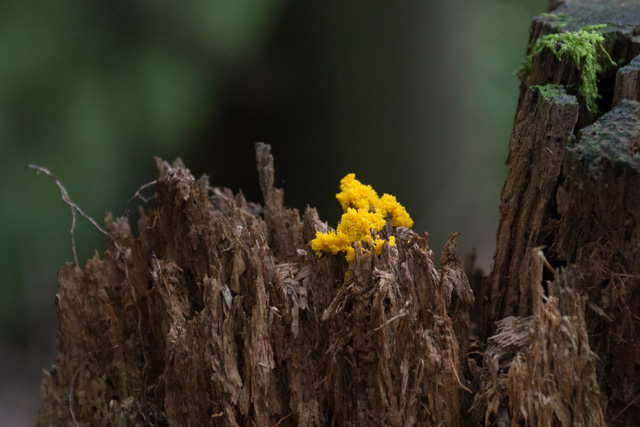 歩くのは楽しい。例えば、この日は赤、青、黄色のキノコを見つけた。勿論、白いのや変な色のものも見つけたが、僕にはこの日、三色揃ったのが何より嬉しかった。青は「ロクショウクサレキン」。多分、赤は「ベニヒガサ」、黄色は「キホウキタケ」だと思うが同定に自信はない。そして赤いベニヒガサはピントが合っていないのが残念だった。ハイキングコースといえど、山を歩くときは時間に余裕をもちたいものだ。