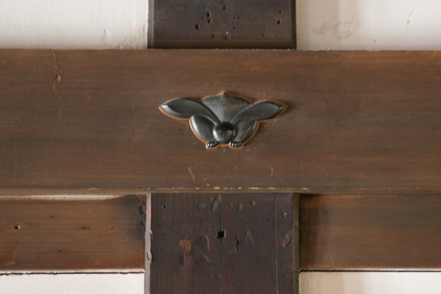 岐阜県高山市を訪れる機会があり、「高山陣屋跡に兎の釘隠があるよ」と教えてもらった。僕は「波と兎」の文様のコレクターだ。高山市のホームページを見ていると青海波と兎を組み合わせたデザインが背景に施されていることに気づく。多分、高山陣屋跡の兎の釘隠に由来するのだろうと考えていた。しかし実際は、写真のように青海波は無く、正面から見た姿をモチーフにしたデザインの釘隠だった。「真向兎(まむきうさぎ)」という名があることを知った。