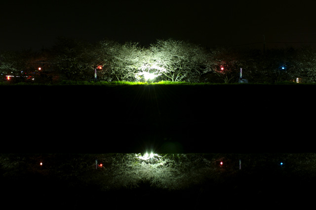 等間隔に照らし出された満開の桜。街灯はほとんどなく、闇夜に浮かび上がって見える。花見用の桟敷も用意されていた。日が落ちてからしばらく経っていたのに、ちらほらと堤防を歩いている人たちの姿がある。対岸の肥田町側から、宇曽川の水面に映りこんだ夜桜が幻想的な雰囲気だった。