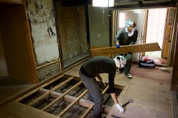 さっそく、9月16日に行われた「手壊しワークショップ」に僕も参加させてもらった。「ワークショップ」と銘打っているが、要は内装の解体作業をみんなでやりましょうというもの。壁や床などの内装材を剥がして外へ運びだし、廃材に刺さった釘は運搬時に危険なので1本1本抜いていく。地道な作業だ。