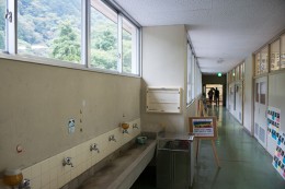 さて、道の駅はというと……、気になった「自分で焼く東近江バーガー」「永源寺ダムカレー」「岩魚天丼」などは、またゆっくり紹介する機会があると思うが、何より中学校の校舎である。当時の備品なども残っていて興味津々、販売に使っているスペース以外にも、教室が展示室に利用されていたりで実に面白かった。体育館、音楽室、階段を登り、廊下を歩く。子どもの頃には巨大な空間だった場所が、何もかも収縮した感じが不思議だった。こんなにも低く小さな机や椅子を使っていたのだ。座ってみるまでもなかったのだが、僕の成長は著しかった。