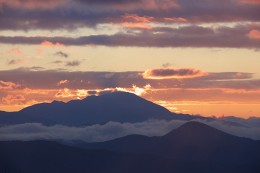 結局、7時を過ぎてもうあきらめようかという頃に、雲の上から姿を現した太陽は日の出とはほど遠い普通の昼間の太陽だった。しかも、思っていたよりもかなり南寄りのところにあった。そう、冬の太陽は低い軌道を通るので、12月1日に賤ヶ岳と伊吹山の山頂を結んだ延長線上から出た太陽は、1377mの頂上の高さに達する頃にはすでに南寄りに進路をとって山頂からは出てこないのだ。つまり賤ヶ岳から見るダイヤモンド伊吹を見ようと思うと、もう数日前に来なくてはならなかったということになる。そもそも日を間違えていたというのが今回のオチなわけだが、冬至を過ぎて来年1月後半にもう一度チャンスがある。次回はもう少し周到に計算して再度挑戦してみたいと思う。