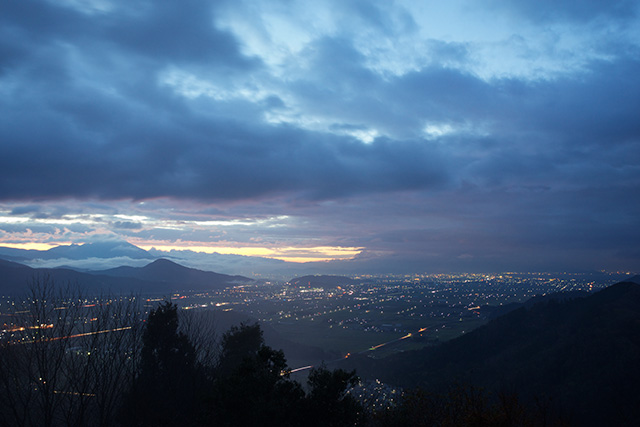 午前6時過ぎ、登りはじめて1時間弱ほどで山頂に到着した僕たちの目の前に広がっていたのは予期せぬ光景だった。山頂から見下ろす木之本から長浜にかけての平野部に無数の明かりが灯り美しい夜景を作り出していたのだ。少し早く到着しすぎたかと思ったが、思わぬご褒美に夢中になってシャッターを切った。そうこうしているうちにいつしか空は明るくなり、伊吹山の後ろの空が朝焼けに赤く染まった。それまで空を覆っていた重い雲は東の空だけ薄くなりつつあった。