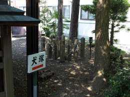 琵琶湖岸にほど近い「平方天満宮」という神社を見つけた。「犬塚はこの奥」と看板が立っている。静まりかえった境内に、看板の文字がひときわ目立つ。犬塚は本殿のそば、柵に囲われてひっそりとあった。