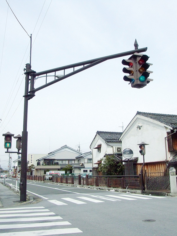 余談だが、御旅所東側の信号機は、縦型で四方の信号が一体になっている。縦型は積雪対策のためで湖北地域ではよく見かけるが、四方一体型は、赤もしくは黄の1灯が点滅するタイプが一般的。この信号機は3色揃った3灯式。そのうえアームが動くとなれば、一見の価値がある(後略)」。