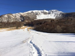 そして迎えた2月11日。予報通り雲ひとつない快晴。また夜が明けぬうちに自宅を出て、7時過ぎに上野登山口に到着した。気温はマイナス3度。放射冷却でずいぶん冷え込んでいたようだ。寒さに凍えながら支度をして登りはじめる。一合目までは樹林帯。もちろん雪はない。冷えた体が温まるように足早に歩く。一合目まで登ると視界が開ける。旧伊吹山スキー場のゲレンデだ。ゲレンデに積もった雪が朝日を反射して眩しい。先を見渡すと先行する登山者の姿がたくさん確認できる。今日は雪山日和、みんなここぞとばかりに登りに来ているのだ。
