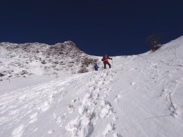 天気はこの上なくよく真っ青な空が広がり日差しが強い。急な坂を登り続けていることもあって汗が噴き出してくるほどだ。雪道は基本的に、先行者の付けたトレース(踏み跡)をたどりながら進んでいくが、ところどころでトレースが分岐していることがある。これは夏道を進んだ人と直登した人それぞれの踏み跡が残っているからだ。どちらを進むか考えながら登るのも楽しい。そうこうしているうちに八合目に到着した。いよいよここから最後の直登、冬の伊吹山のハイライトだ。最後の直登に備えてアイゼンを装着する。