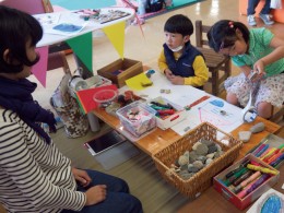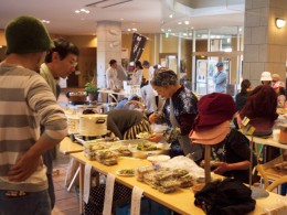 放っておけば加速度的に忙しくなるような働き方をしてしまう私のようなものが「ゆっくりマルシェ」を訪れたのは、やっぱりその「ゆっくり」ということばが気になったせいだと思う。初回の今回はオーガニックな食材でつくった食べ物、フェアトレード商品や木工作家の作品、リサイクル商品、ワークショップなど30店舗ほどのお店が出店。同じく伊吹山のふもとにある岐阜県からも出店が目立った。また、出店者などの参加者をゲストスピーカーとして語らう「カタリバ」という場が設けられていて、終始ひとびとが膝を突き合わせて話している姿が続いているのも、ほかのマルシェではあまり見ない風景だった。さらに、マルシェの後には東日本大震災をテーマとした映画が上映された。