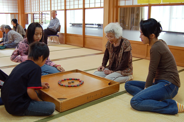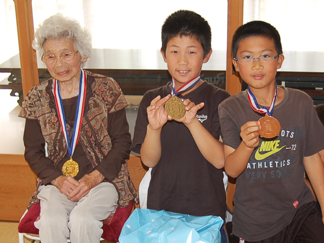 今年、尼子地区で参加者18名のトーナメントを制したのは、宮尾 計(かずえ)さん。参加者中最高齢の92歳である。対戦した小学生が舌を巻くほどの正確なコントロールで、次々にパックをポケットに落としておられた。子どもの頃はよく遊んでいたけど、昨年、この大会に初参加するまでの数十年間はカロム盤に触れることもなかったのだそうだ。2位と3位になった小学生は本気で悔しがっていた。