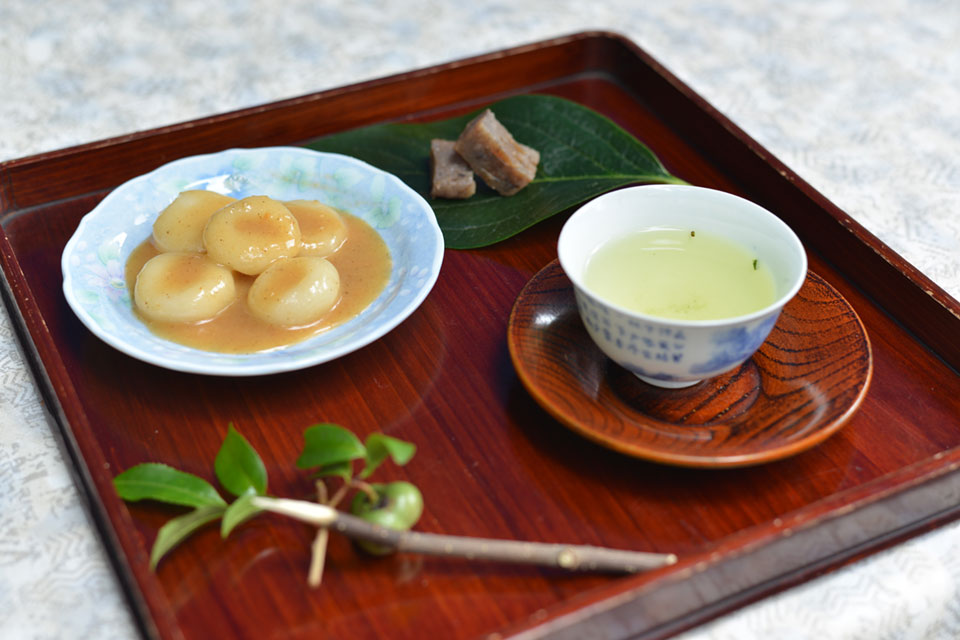 当日は、地元の人の気迫が低気圧を押しのけたような清々しい秋晴れとなった。鯨幕の前にずらりと並ぶ能面と能衣装の他に、老人クラブによる「よ〜きて喫茶」が、普段は氏子しか口にすることのできない「へそ団子」と地元特産の政所茶を振る舞い、京都大学観世会が謡曲や仕舞を披露して華を添えた。私も手伝いとして参加させてもらったのだが、当日は「70代は朝7時集合、80代は8時集合ね」と、まさに集落総出で準備運営にあたったのである。