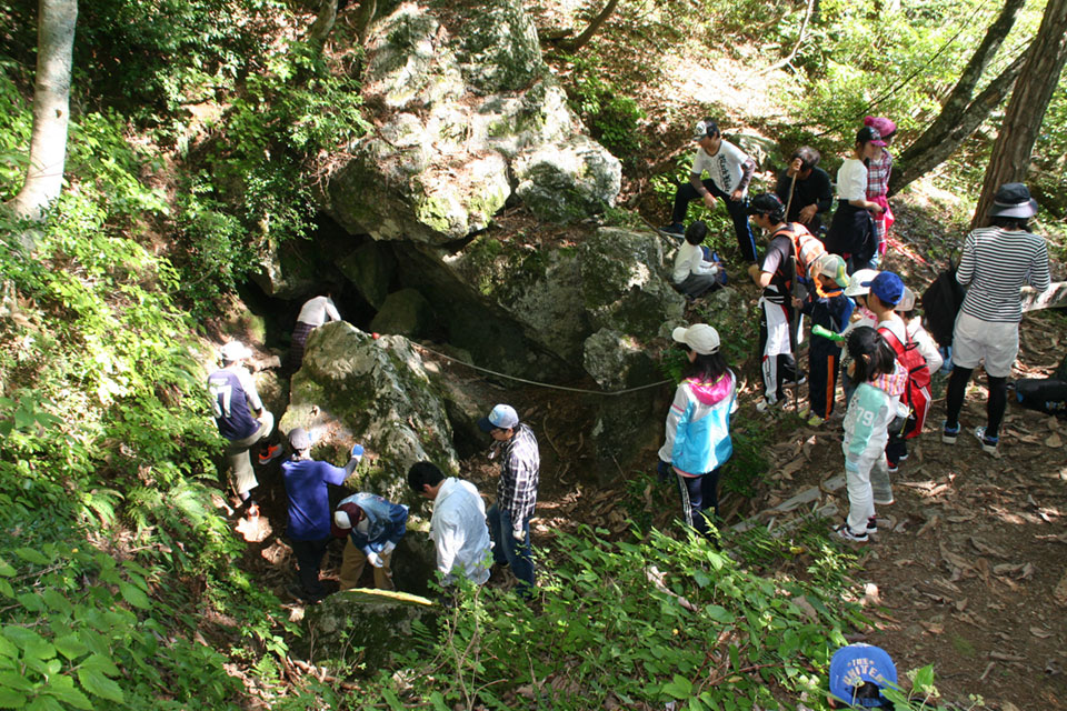 そこは、地元の人たちが「北谷」と呼ぶ山の中腹、標高約560㍍の地点になる。設置された梯子をつたって入り口近くに降りられるようになっていて、岩窟内部にも梯子がある。入り口は狭く、内部の梯子に体を沿わせるように侵入する。内部はもちろん真っ暗で、懐中電灯やヘッドランプの明かりが闇を照らす。広さは25平方㍍ほどあるそうだが、土砂が入り込んでいて広さに対する感覚ははっきりしない。一度にたくさんは入れないので、班ごとに順番に岩窟内部を体験する。人気をさらったのは岩窟内部に棲むコウモリで「触ったら暖かかった」とか「ふわふわしてた」と興奮気味に話す子も。しかし、たくさんの来訪者に驚いたのかコウモリは岩窟の外に飛び去ってしまい、順番を待っていた子どもたちは残念がる。岩窟から出てきた子どもに感想を聞くと、「怖かった」や「じゅくじゅくしていて滑った」などなど。お父さんの一人は「なかなかのものでした」。
