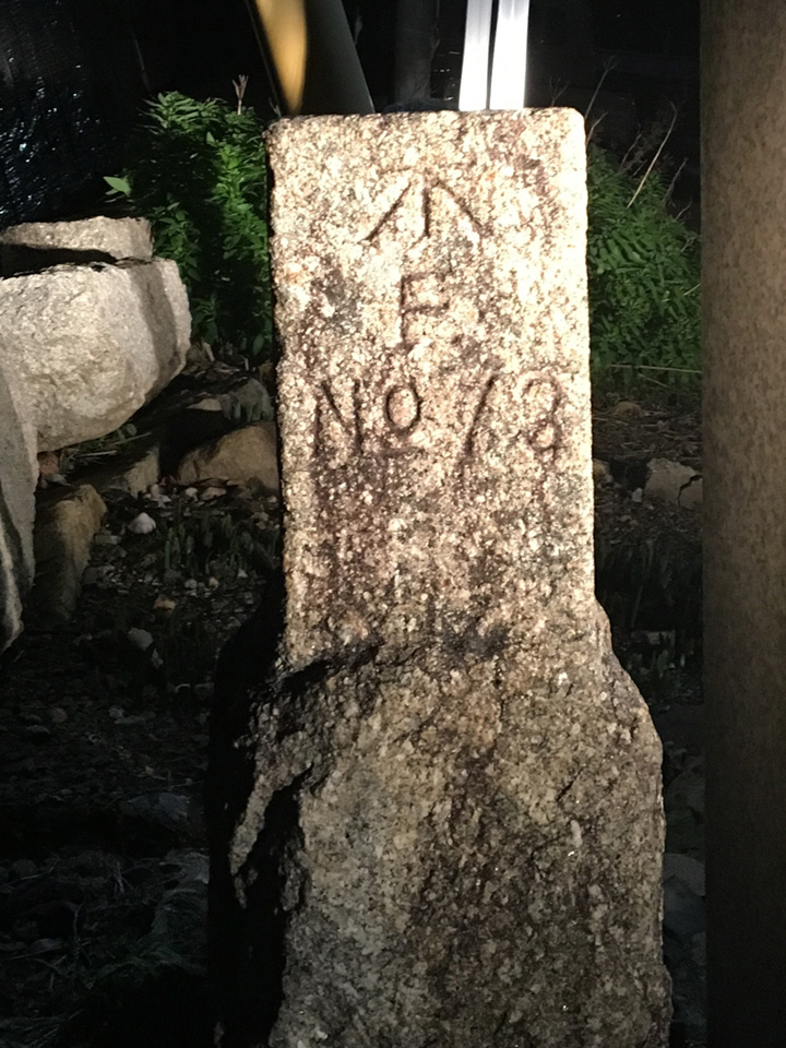 調べてみると、「明治政府は明治4年に測量司を設けイギリス人マクヴィーンの指導で日本で最初の三角測量を始めた」(「几号水準点とは」山岡光治氏のHP)、「近代内務省では1876年(明治9)頃から水準測量を開始」(「几号水準点の始まり」上西勝也氏のHP)。当時は水準測量のことを高低測量といい、測量で用いられた几号(きごう)標識が残存している。この標識が「明治水準点」である。「几号水準点」、或いは、「高低几号」、「几号高低標」、漢字の「不」に似ていることから「不号水準点」とも呼ばれている。独立した標石のほかに建物、鳥居などの永久構築物に刻印された場合もある。永久構築物は不朽構造物ともいい、朽ちず動かないであろうものに「几号」が刻まれたのだ。不朽物としては石造橋梁、石垣、神社の鳥居、灯篭、狛犬の台石などである。