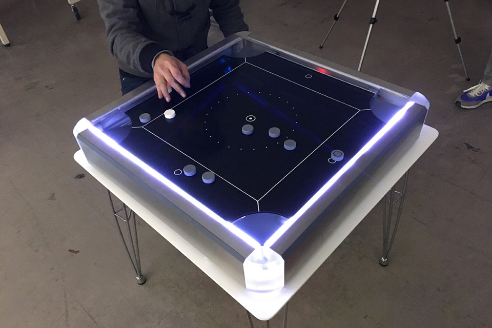 カロムの魅力のひとつは狙ったパックがイメージ通りにポケットに入った時の喜びにある。そこに音という要素が加わる。勝つための戦略より、クッションを使い思い通りにパックを落としたいという欲求が優先される。かつて南極観測の隊員たちがレクレーションとして楽しんだカロムは、必ずストライカーかパックのどちらかをワンクッションさせてからパックをポケットに入れなければならないというルールがあった。このNew tableならば、クッションも正確にとれる。競うパックの数を減らしワンクッションルールを採用すると、高度なテクニックも要求され、よりビリヤードのように楽しめるのではないか……。