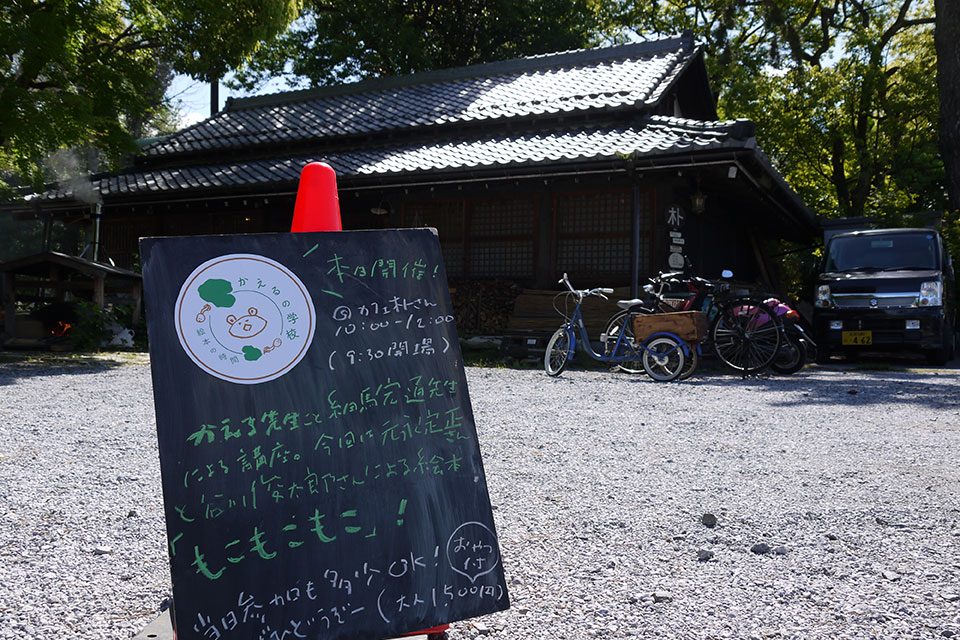 テーマは「絵本」。それにともない、子連れの方も来やすいように休日の午前中に開催時間をあらため、半月舎では手狭なので、近所の護国神社境内にある「ほっこりカフェ朴」さんの、板敷きの部屋を借りることにした。