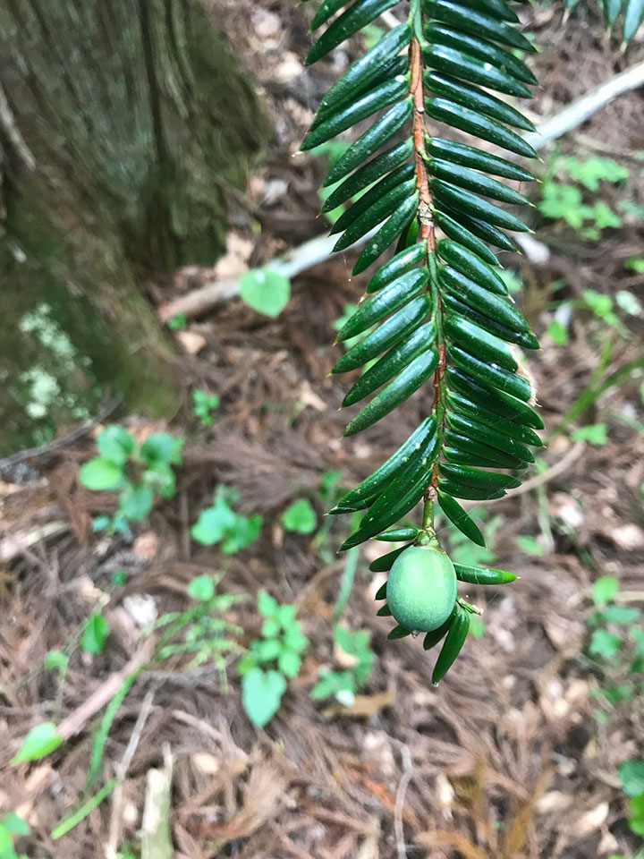 バイは「イチイ科・カヤ属カヤ」の変種「チャボガヤ」ではないかと考えられるが、植物学的に正確な名称は知らないと記してある。カヤが直上して成長するのに対して、バイは地面を這うように成長するそうだ。もともと古橋周辺の山に自生していたのか栽培されたのかは不明だが、日当たりのよい斜面に多くみられ、実の採取の歴史は江戸時代以前ではないかと考えている。喜平さんは「バイは古橋にとって大切な植物だったが、現在は忘れ去られようとしている。残念で仕方がないので冊子にした」と言われた。冊子にはバイの生態から始まり、バイ山の手入れ、収穫方法とその後の処理方法、かつてあった※割山(わりやま)制度などが事細かに書かれていて、山から生活の糧を得ていた先人の暮らしぶりと、自然をおろそかにせず、その土地で一生懸命に生きていた人たちの歴史が詰まっているように思えた。