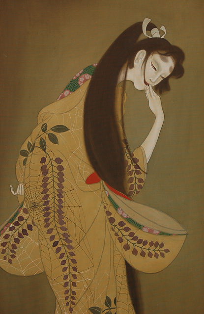 色白な女性が描かれていた。髪は足元に届くくらい長く、後れ毛を口に咥えている。美しいと思った。視線を外しても、引き戻される……。着物に描かれた藤の花とクモの巣の柄が印象的だった。いわゆる「うらめしや〜」と語られる幽霊とは違う雰囲気である。