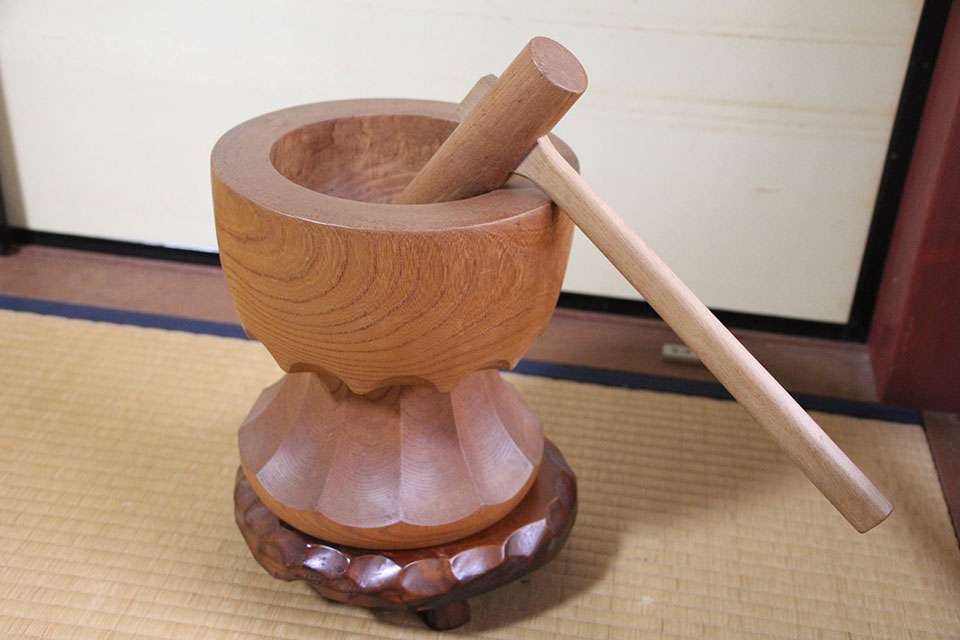 木彫が趣味の喜平さんはご自宅にいくつか作品を飾っておられ、部屋の隅に置かれた小さな臼と杵もその一つ。飾る理由を、「餅を搗くというのは、もちつく、持ち続けるに通じますのや。財産を持ち続けるとか、良い習慣を持ち続けるとか、身につくとか。臼と杵はその象徴でめでたいものということです」。喜平さんに教わると、お正月に餅を食べる意味、嫁かがみが餅である意味、臼と杵はただ臼と杵ではないこと、「ふーん」と合点がいったような、あたたかな気持ちになった。