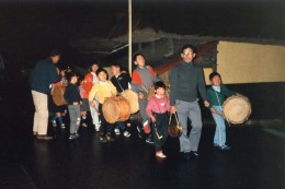 拍子木や太鼓、鉦も叩いて行われる夜回りは、「だいいち、ひのよー」と声をあげる。「第一、火の用心」の意で、「だいいち」のあとにトンと鳴りものの音が入り、「ひのよー」の後にトントントンと3回打つ。昭和63年、喜平さんがトウヤを務めた際には、夜回りの子どもたちにお菓子やおにぎりを振る舞ったといい、子どもたちにも楽しみの一つだったことだろう。