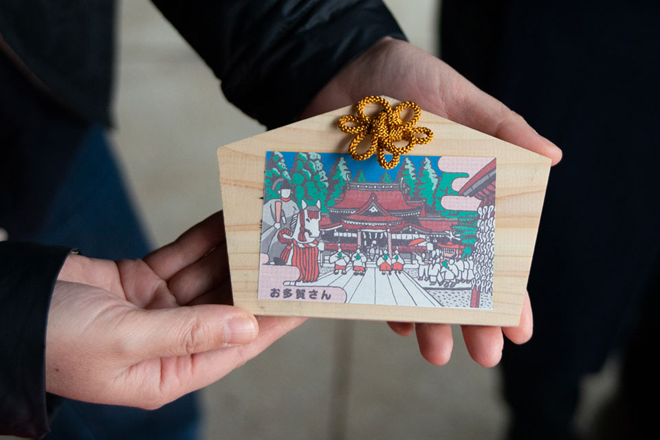 まず、多賀町観光案内所(多賀町多賀389-1)または近江鉄道多賀大社前駅観光案内所で「絵馬札セット(叶絵馬と絵馬札)」(700円)を購入する。