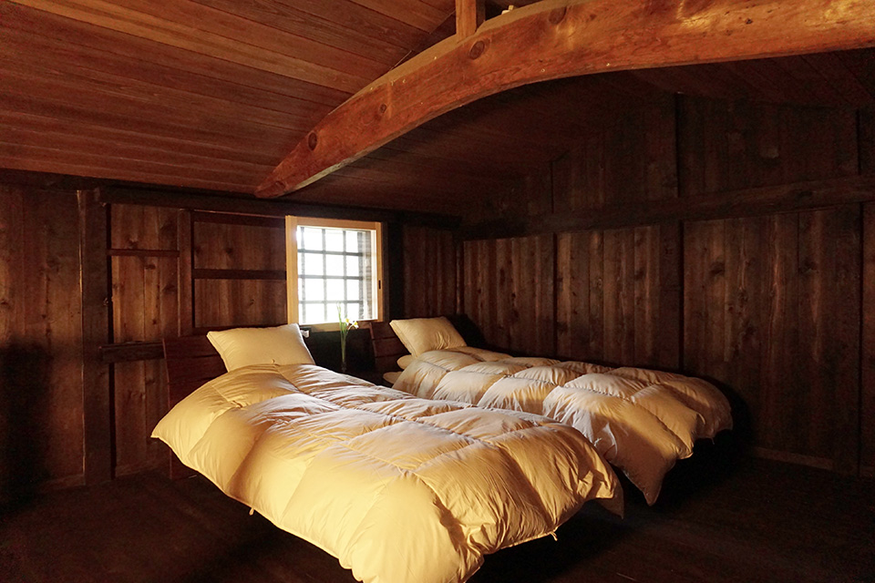 さて、今回の改修工事で大きく変わったところは、宿泊施設になったところだ。これまでの活動に携わってきた有志で設立した合同会社(Limited Liability Company)が「多賀さとの宿一圓屋敷」を運営する。写真のように庄屋屋敷らしい大きな梁をながめながら、ふかふかのベッドで休むことができる。お風呂あがりに休憩するラウンジからは、杉坂峠の三本杉が見える。江戸時代の後期に建てられた国の登録有形文化財である一圓屋敷の築150年を十分古いと思っていた私たちは、目の前に現れた三本杉に、はるかな神話の時代を感じることとなった。三本杉は、国生みの仕事を終えられた伊邪那岐大神が高天原からこの峠に降りて休憩をされた場所だ。