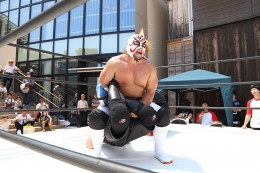 そして、平居さんは「長浜プロレス」を立ち上げ、今年の6月22日プレ旗揚げ興行として、「えきまちテラス長浜」でエキシビションマッチを行った。エル・ヒキヤマ vs MITSUNARI(石田三成の化身)。曳山まつりを盛り上げるというだけあって、ご当地キャラのMITSUNARIもヒール(悪役)で登場。エル・ヒキヤマの必殺技長浜クローバーホールドが炸裂した。