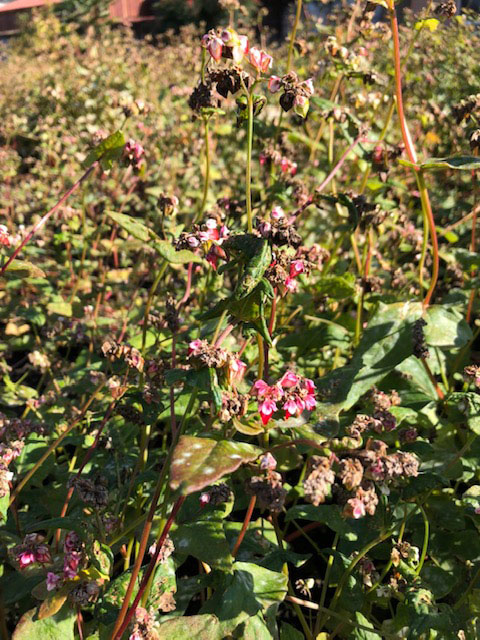喜平さんは、平成19年から約10年間、伊吹山文化資料館(米原市)が開く講座で子どもらに伊吹大根と、伊吹がそばの発祥地だというお話を聞かせ、そば打ちの指導もしてこられた。子どもらはそばの栽培を行っていて、そのそばは喜平さんが種を分けてあげた「信州大そば」という品種の突然変異種なのだとか。白い花が咲き、実を付けるころ赤みを帯び、やがて黒くなるそばで、畑の片隅にたった一株あったものから種を増やされた。
