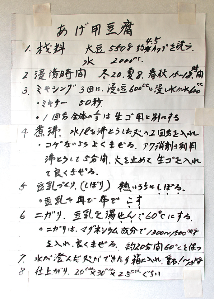うまい油揚げを作る方法は、水と一緒にすりつぶした大豆(生呉)をすべて煮ず、少量を取り分けておき、火を止める直前、最後に加えるのだそうだ。そうすることで「油で揚げる際によく膨らむ」と喜平さん。大豆をすりつぶすことから始める油揚げ作り、考えただけでも大変そうだが、喜平さんの秘密基地でいつか手ほどきを受けたいとも思っている。珍しい料理のことも教わり、紹介できればと思う。