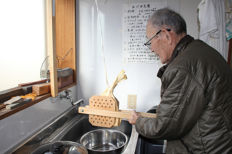 豆腐作りは、農業改良普及員時代に生活改良普及員が行った栄養指導の講座を見たのがきっかけで始められたが、それより前、母の小春さんが豆腐屋さんに嫁いだ伯母の家で子守をしながら豆腐作りを見ておられた記憶を喜平さんに話されたこともきっかけになっているようだ。
