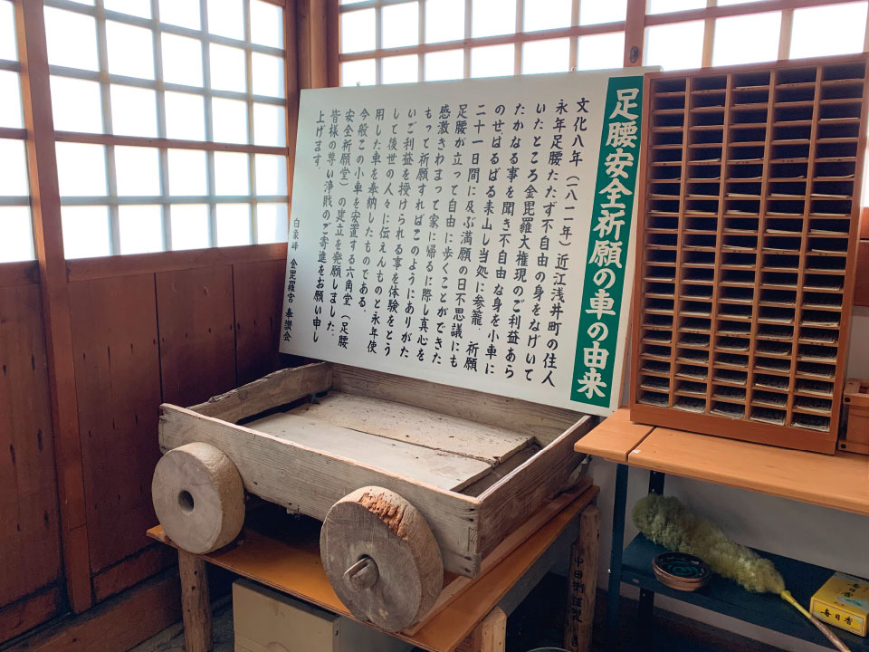 「文化8年(1811)、永年足腰たたず不自由な身を嘆いていた近江浅井町の住人が、金毘羅大権現のご利益を聞き、不自由な身を小車にのせはるばる来山し、参籠祈願21日間に及ぶ満願の日、足腰が立って自由に歩くことができた」という実話が残っている。ご利益を受けた体験を後世に伝えるため奉納された小車の実物が展示されている。
