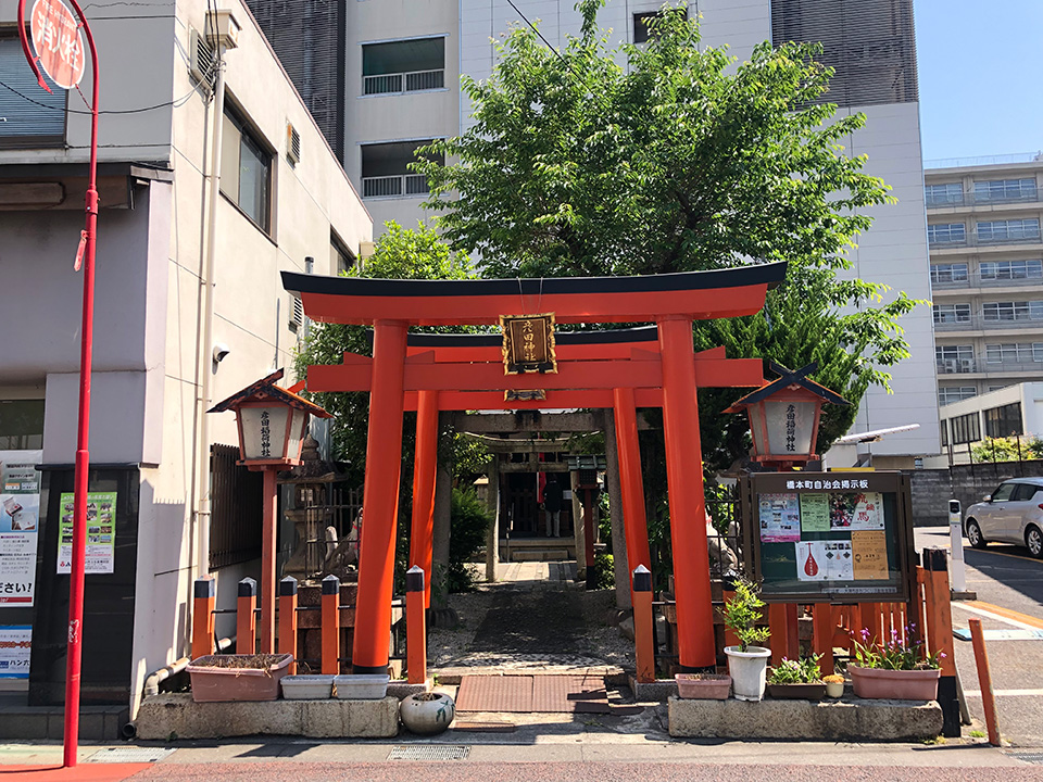 そんな彦根藩大津蔵屋敷の中に寛政12年(1800)勧請の稲荷社が建っていたことが絵図でも確認されている。現在は少しだけ場所を移したが蔵屋敷跡地に当たる場所で彦田稲荷神社として残され当時の面影を垣間見ることができる。