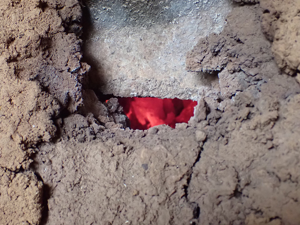 平成17年7月に「廃れつつある炭焼きの技術を後世に継承する」ことを目的に「余呉炭焼倶楽部」が発足した。以来、石橋さんは倶楽部の会長を務めてこられたが、炭焼きを生業にしていたわけではなく、ご自身も先輩たちから炭焼きを学んでこられた。二つ築かれた倶楽部の窯の一つを子林さんと堀田さんが石橋さんの指導で修復し始めたのが昨年の4月。炭材をいっぱいに詰め終わった12月に窯の天井を作り上げ春を待つことになった。窯の内部と天井は土壁である。壁を乾燥させるために窯の入り口で火を焚き、送風機で風を送り始めたのが5月ごろだった。