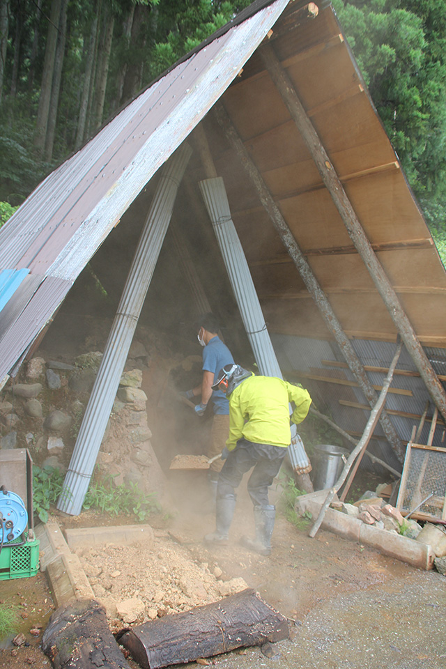 長浜市で林業や森林整備で地域おこし協力隊として活動している子林葉さん(37歳・余呉町東野)と堀田涼介さん(27歳・余呉町下余呉)が、初めて挑戦した炭焼きの成果を確かめる炭出しをされると聞き、7月下旬、余呉町上丹生へ見せてもらいに行った。窯の焚き口を塞いだ壁をいよいよ崩し始めるところだった。