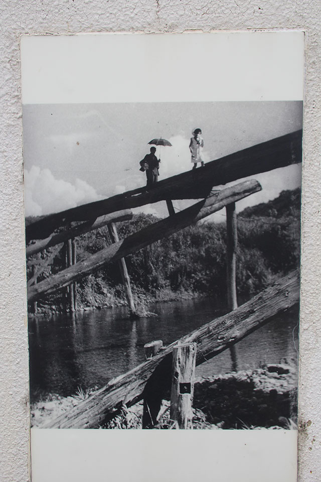 日傘をさした女性は着物姿、帽子をかぶった少女はノースリーブの服を着て、綿菓子を食べているようにも見え、手には丸いものを下げている。橋は思っていた以上に高い。喜平さんは「着物を着てやはるので、縁日の日やな」。おそらく木之本地蔵の縁日の帰りだろう。さらに「橋の幅は3尺ほど。丸太を二つ割りにして、太さが揃うように天地を互い違いにしてあるんや」と話す。「怖くはなかったですか?」と尋ねると、「怖い?ほんな事は思わんな。川向うには田や畑があるやろ、仕事にいくのに怖いちゅなことは言うてられん」。以前、井立ての普請に参加した話を聞いた時、「川に入っての作業は水が冷たかったでしょう?」と尋ねると「水が冷たいちゅなことは思わん。なにがあろうとせんならんことはせんならん」と喜平さんは言ったが、あの時と同じだ。せんならんことはせんならんのであり、そのためにはどんな橋でも渡らねばならないのだ。