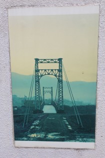 古い橋の写真がお寺にあると聞いたが、わざわざ見せていただくのも気が引けると思っていたら、現在架かる橋の親柱にその写真があると教えてくれる人がいて、さっそく写真を撮り、喜平さんに見せた。